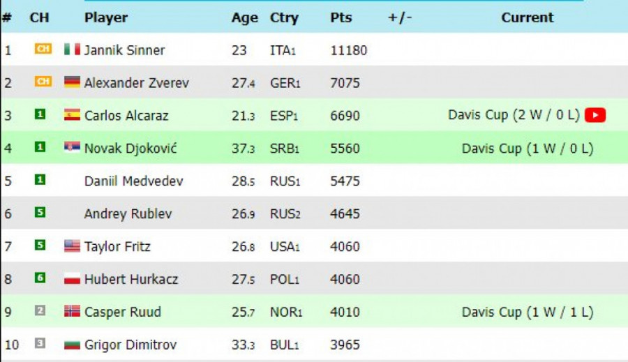 Na čelnoj poziciji i dalje se nalazi Italijan Janik Siner koji ima 11,180 poena, a slede ga Nemac Aleksander Zverec (7.075) i Španac Karlos Alkaraz (6.690).