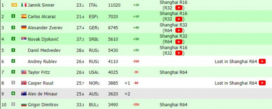 Na vrhu liste nalazi se neprikosnoveni Janik Siner sa impresivnih 11.020 bodova, dok se na drugom mestu nalazi Karlos Alkaraz sa 7.020 bodova. Aleksander Zverev je trenutno na trećoj poziciji sa 6.745 bodova, dok je Danil Medvedev peti sa 5.430 bodova.