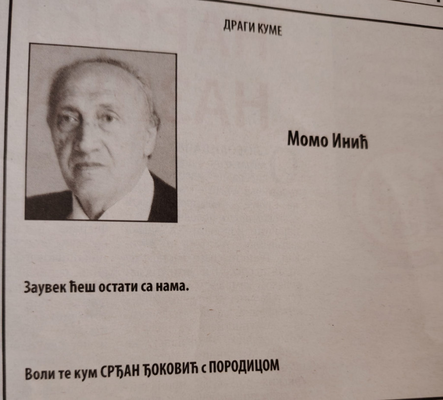 - Dragi kume, zauvek češ ostati sa nama. Voli te kum Srđan Đoković s porodicom - poručio je Srđan.