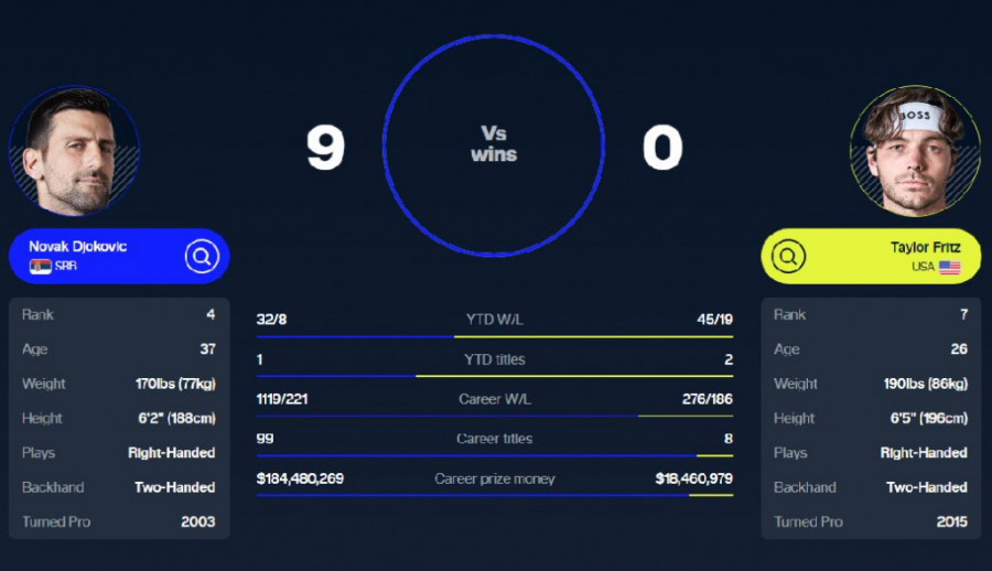 Današnji susret Đokovića i Frica će biti njihov deseti međusobni susret. Đoković je do sada ubedljivo trijumfovao na svakom prethodnom meču, osim jednog (Australijan open 2021) koji se završio posle pet setova i tri i po sata igre. Navijači se nadaju da će Đoković i danas rutinski rešiti meč u svoju korist.
