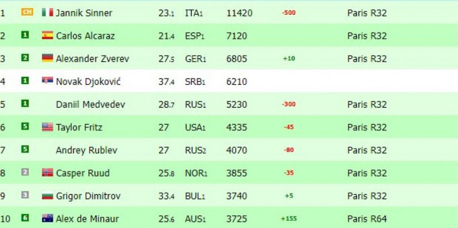 Na vrhu ATP liste i dalje se nalazi Janik Siner sa 11,420 bodova, dok je drugi Karlos Alkaraz sa 7,120 bodova. Sledeći na listi je Aleksandar Zverev sa 6,805 bodova, dok je Danil Medvedev peti sa 5,230 bodova. Listu TOP 10 tenisera planete popunjavaju Tejlor Fric, Andrej Rubljov, Kasper Rud, Grigor Dimitrov i Aleks de Minor.