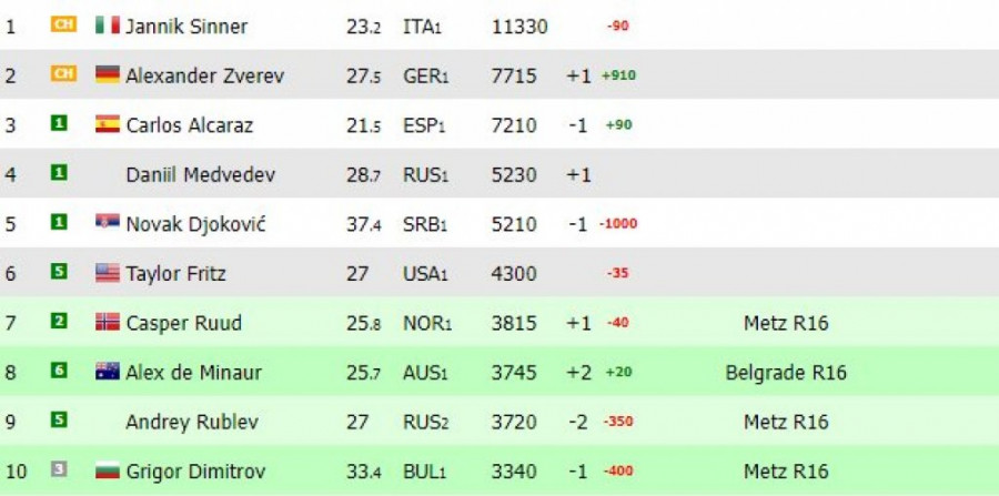 Nemački teniser Aleksandar Zverev uspeo je da nadmaši Karlosa Alkaraza i zauzme drugu poziciju na ATP listi sa 7,715 osvojenih bodova. Ovo je rezultat njegovog nedavnog osvajanja sedmog masters trofeja u karijeri, što predstavlja njegov najbolji plasman do sada, dok se na čelu liste i dalje nalazi Italijan Janik Siner sa 11.330 poena.