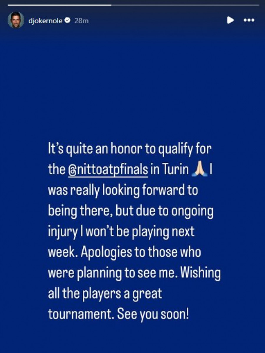 - Čast je kvalifikovati se za Torino. Zaista sam se spremao da idem tamo, ali zbog povrede, neću igrati sledeće nedelje. Izvinjavam se svima koji su planirali da me gledaju. Želim svim sportistima sjajan turnir, vidimo se uskoro - istakao je Novak Đoković