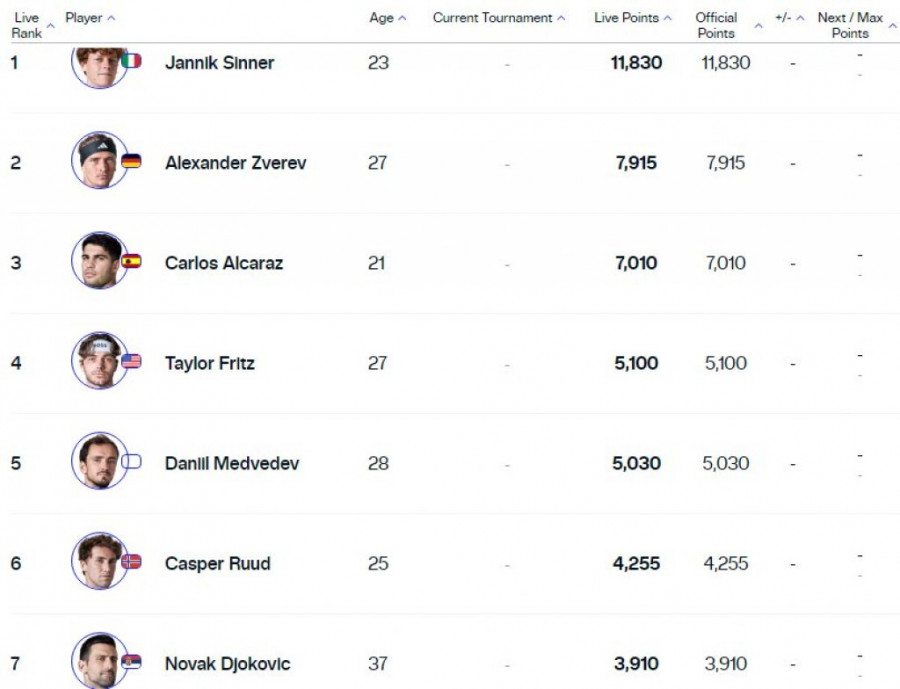 Prvi na ATP listi i dalje je Janik Siner sa 11.830 bodova, dok je drugi Nemac Aleksandar Zverev sa 7.915 bodova. Mladi Španac Karlos Alkaraz nalazi se na trećem mestu sa 7.010 poena, dok je Tejlor Fric napredovao jedno mesto i sada zauzima četvrtu poziciju sa 5.100 poena.