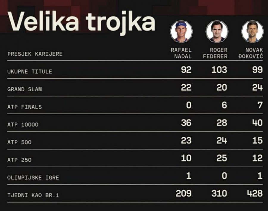 Još jedan impresivan podatak je međusobni skor Novaka Đokovića sa njegovim rivalima. Naime, Đoković vodi u međusobnim duelima i sa Federerom (27:23) i sa Nadalom (31:29), što dodatno potvrđuje njegovu dominaciju u teniskom svetu.