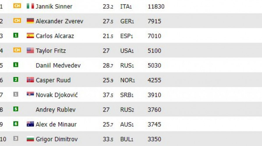 I dalje se na pol poziciji nalazi Italijan Janik Siner sa 11.830 poena, dok drugoplasirani nemac Aleksander Zverev ima gotovo 4.000 bodova manje. Listu TOP 5 igrača planete popunjavaju Karlos Alkaraz (7.010), Tejlor Fric (5.100) i Danil Medvedev (5.030).