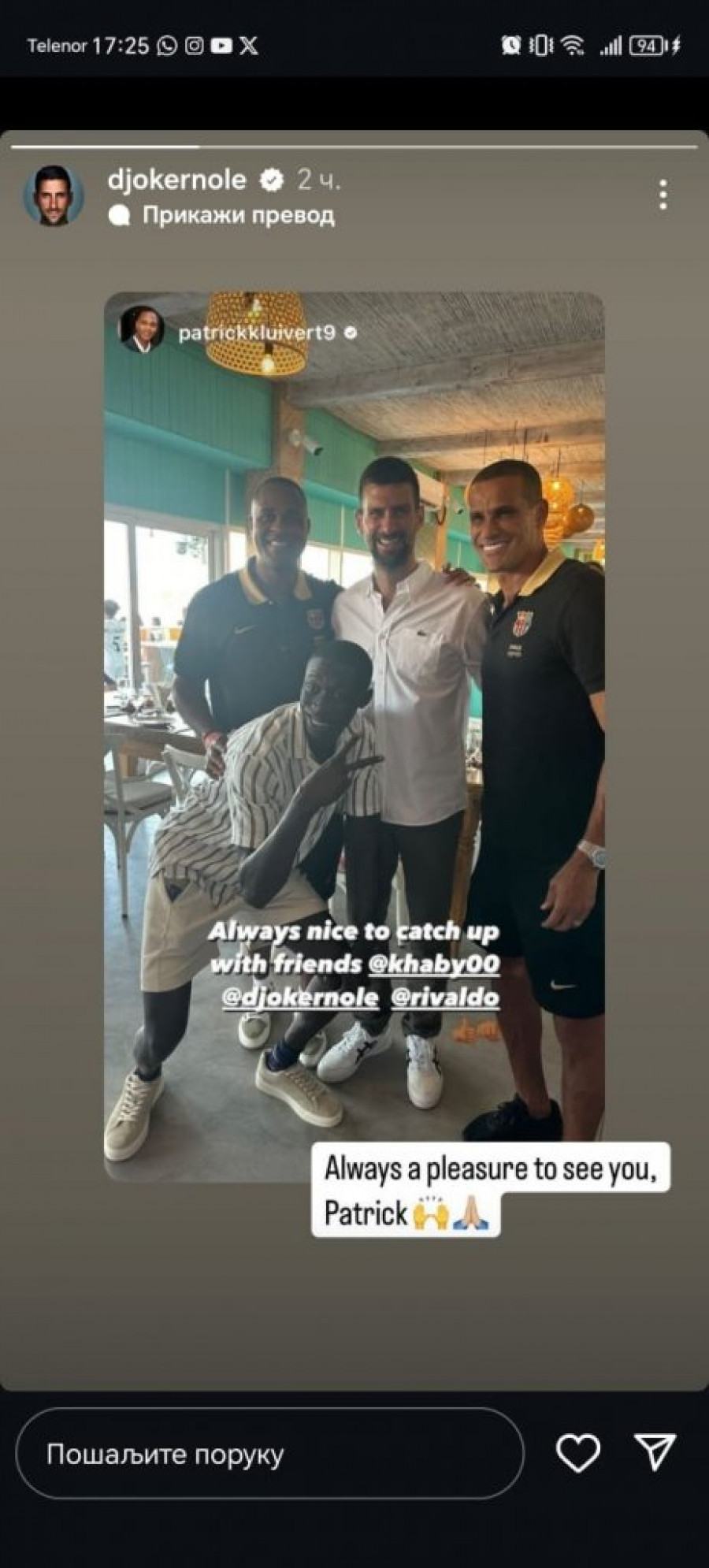 Tokom svojih putovanja, Novak se susreo sa nekadašnjim fudbalerima Barselone, Rivaldom i Patrikom Klajvertom. Njegova pojava izazvala je pažnju čak i legendi svetskog sporta, a susret sa influenserom Kabijem Lejmom ovekovečen je prikladnom fotografijom koju je Klajvert podelio na svom Instagram nalogu. Novak je odgovorio, ističući da mu je uvek zadovoljstvo videti stare prijatelje.