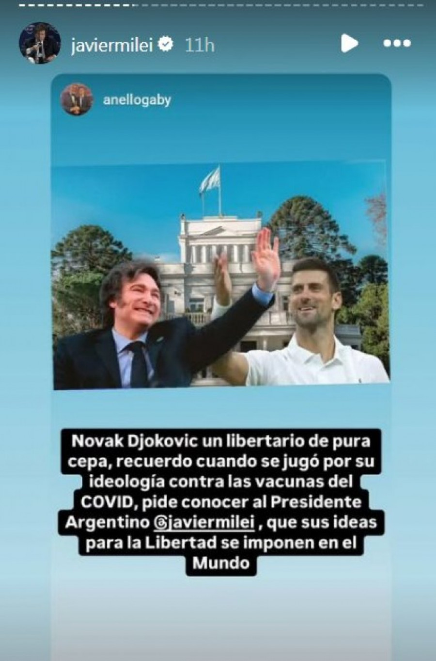Predsednik Argentine je na svom nalogu na društvenoj mreži podelio komentar jednog korisnika koji je podsetio da je Novak tokom pandemije koronavirusa bio zagovornik slobode izbora u vezi sa vakcinacijom. Takođe, istaknuto je da je Novak rizikovao karijeru jer nije želeo da se vakciniše i da mu je bilo zabranjeno da se takmiči. Ovo je samo jedan od primera gde Novak Đoković nije samo vrhunski sportista, već i javna ličnost koja iznosi svoje stavove o važnim društvenim pitanjima.