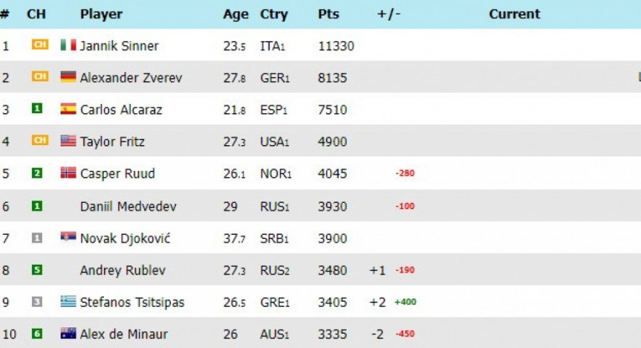 Janik Siner i dalje drži prvo mesto na ATP listi, sa 11,330 bodova, iako je suspendovan do 4. maja zbog doping skandala. Italijan je izgubio 500 bodova zbog neučešća na turniru u Roterdamu, ali i dalje ostaje lider na listi najboljih tenisera sveta.