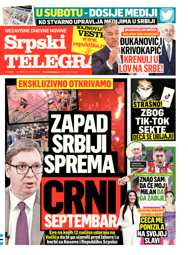 Naslovna strana Srpskog telegrafa za 19.08.2021.