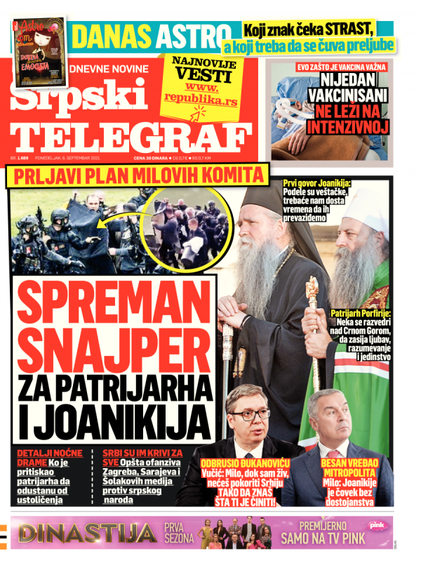 Naslovna strana Srpskog telegrafa za 06.09.2021.