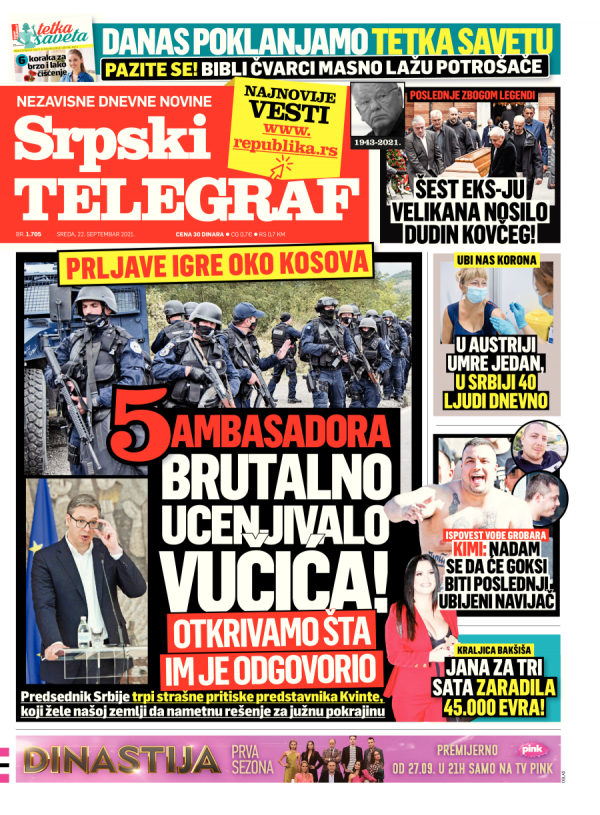Naslovna strana Srpskog telegrafa za 21.09.2021.