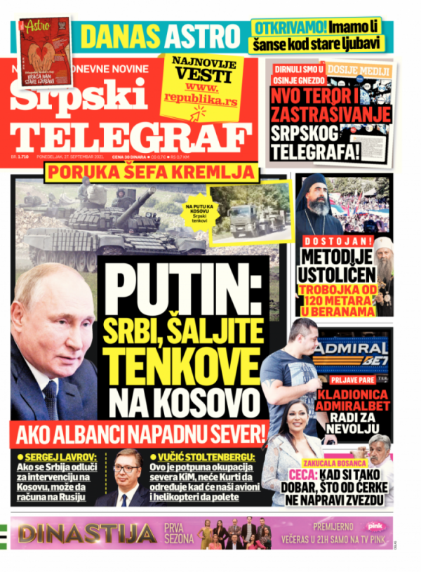 Naslovna strana Srpskog telegrafa za 27.09.2021.