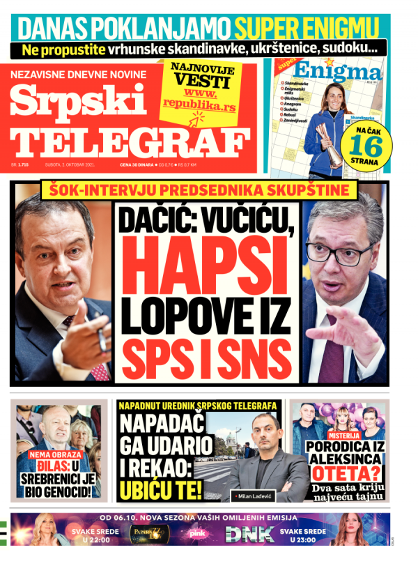 Naslovna strana Srpskog telegrafa za 02.10.2021.