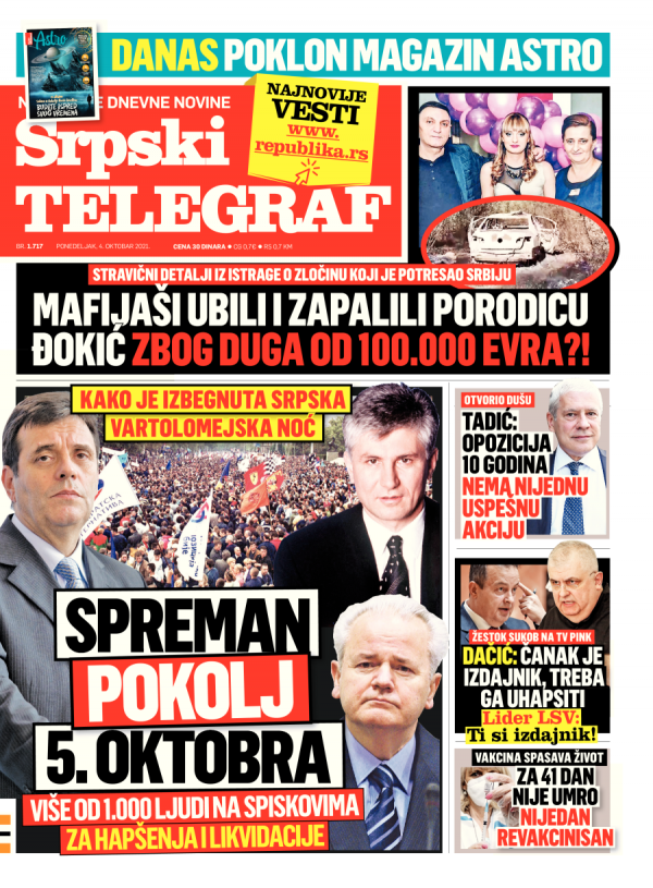 Naslovna strana Srpskog telegrafa za 04.10.2021.