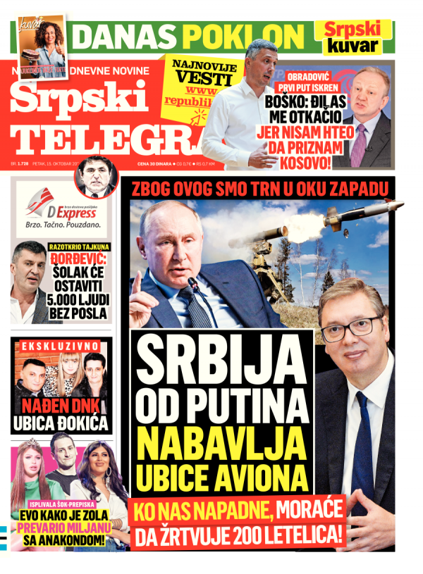 Naslovna strana Srpskog telegrafa za 15.10.2021.