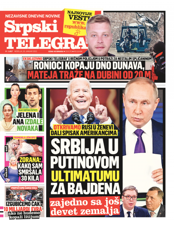 Naslovna strana Srpskog telegrafa za 16.01.2022.