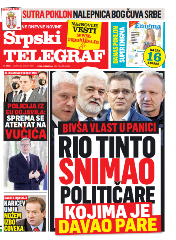 Naslovna strana Srpskog telegrafa za 22.01.2022.