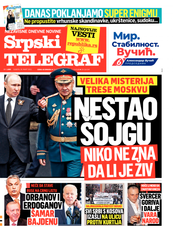 Naslovna strana Srpskog telegrafa za 26.03.2022.