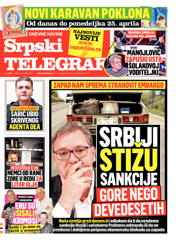 Naslovna strana Srpskog telegrafa za 20.04.2022.