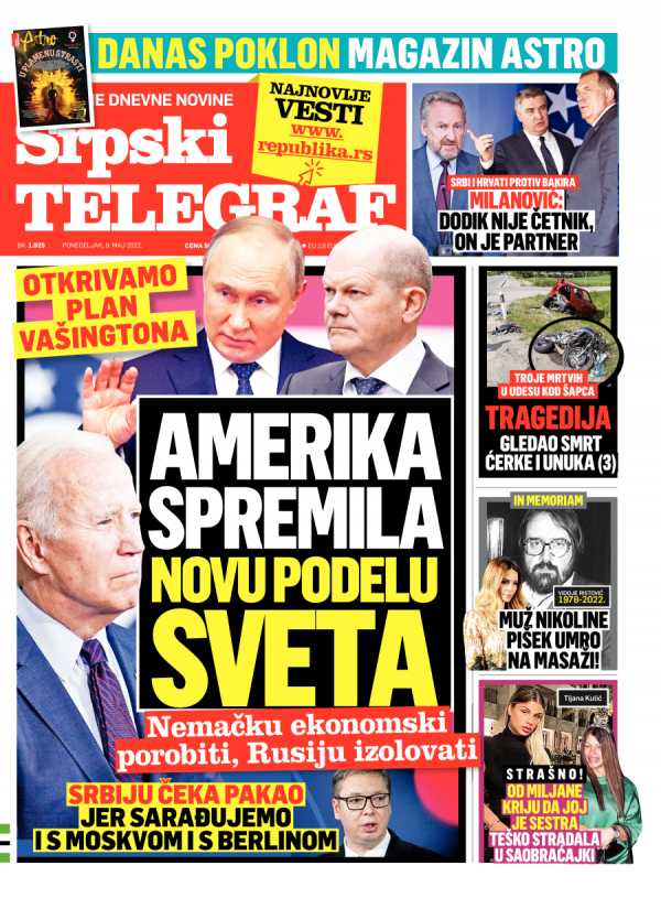 Naslovna strana Srpskog telegrafa za 09.05.2022.