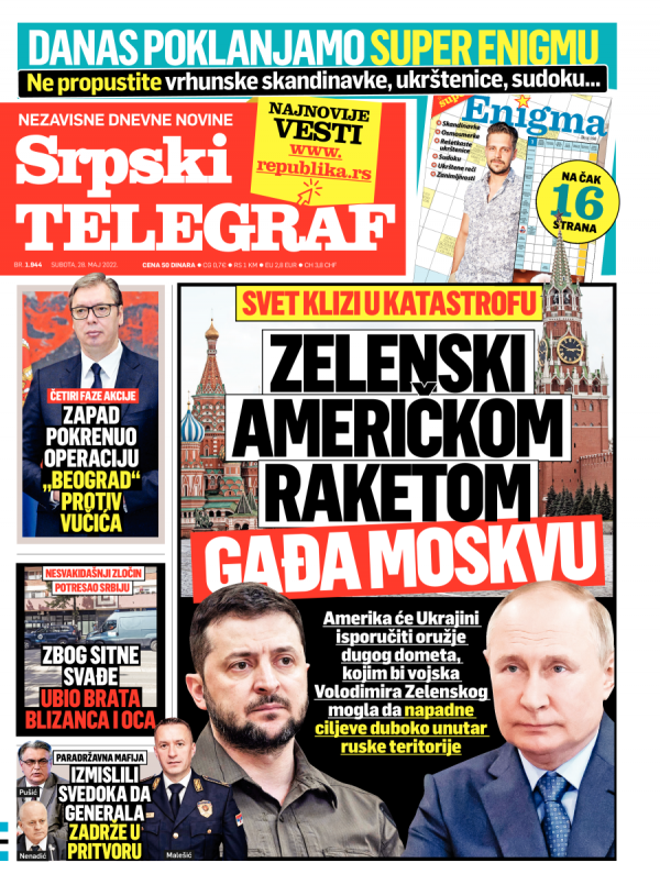 Naslovna strana Srpskog telegrafa za 28.05.2022.