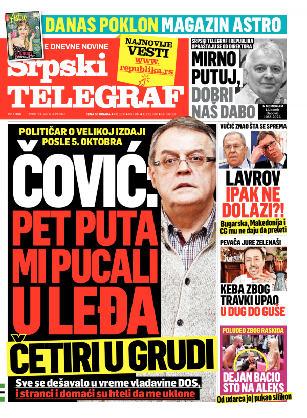 Naslovna strana Srpskog telegrafa za 06.06.2022.