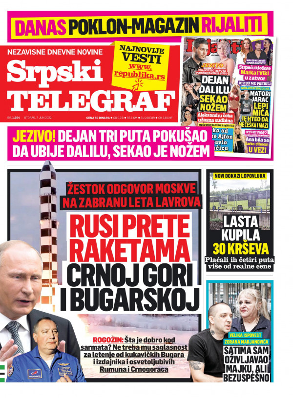 Naslovna strana Srpskog telegrafa za 07.06.2022.