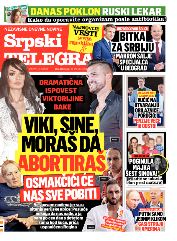 Naslovna strana Srpskog telegrafa za 16.06.2022.