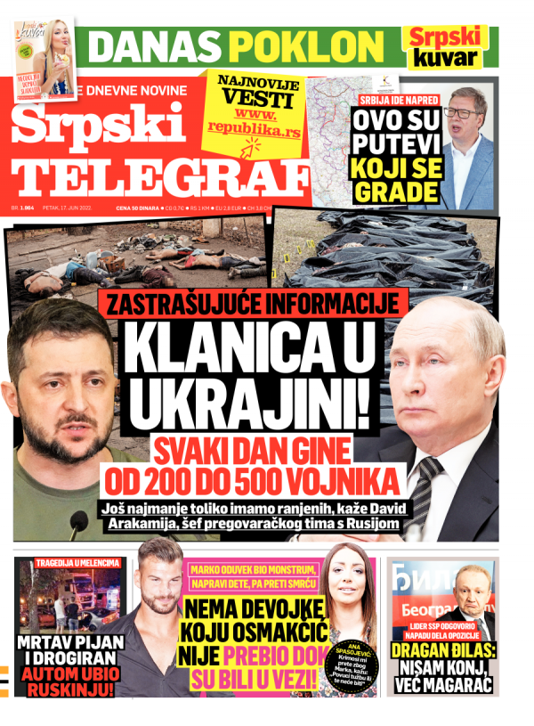 Naslovna strana Srpskog telegrafa za 17.06.2022.