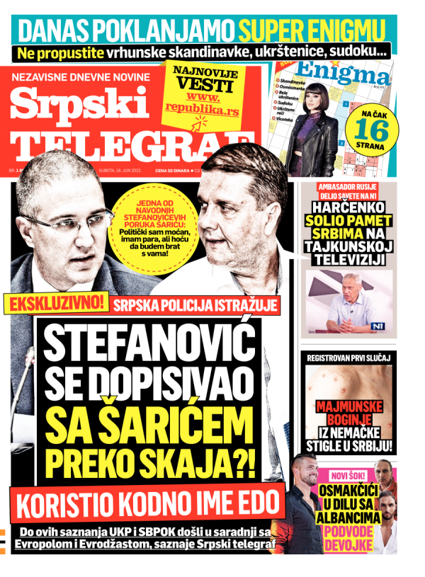 Naslovna strana Srpskog telegrafa za 18.06.2022.