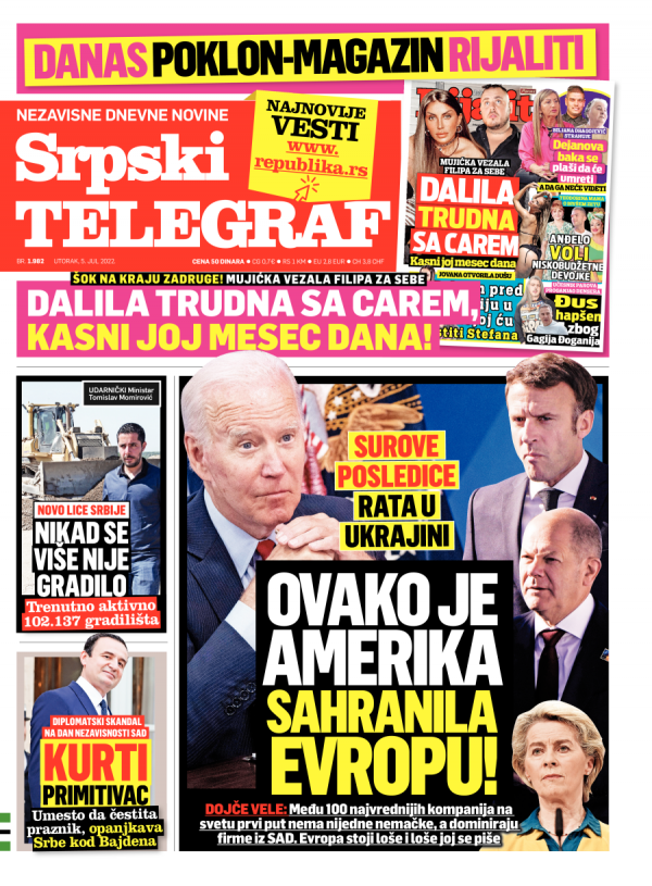 Naslovna strana Srpskog telegrafa za 05.07.2022.