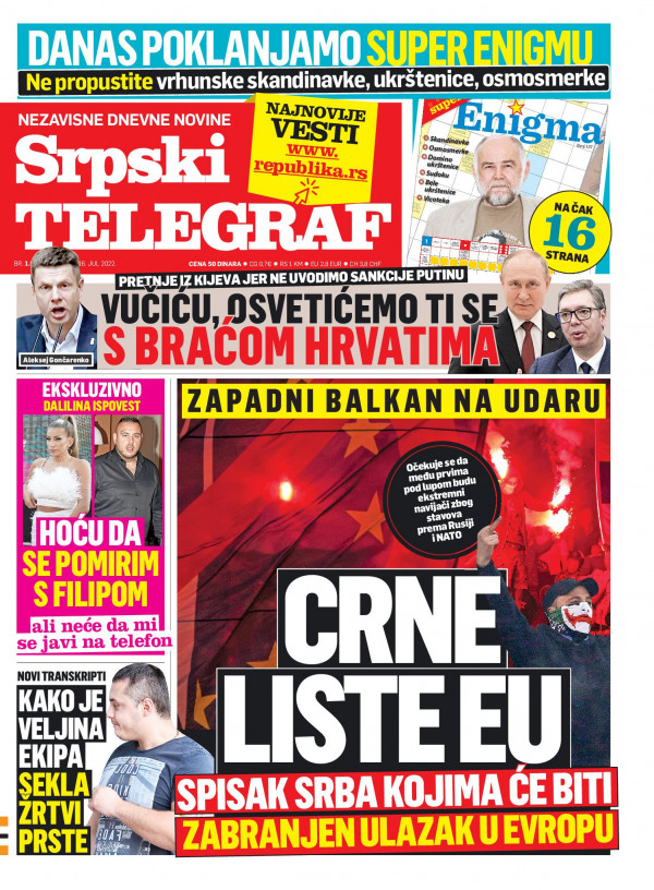 Naslovna strana Srpskog telegrafa za 16.07.2022.