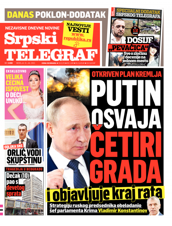Naslovna strana Srpskog telegrafa za 31.07.2022.