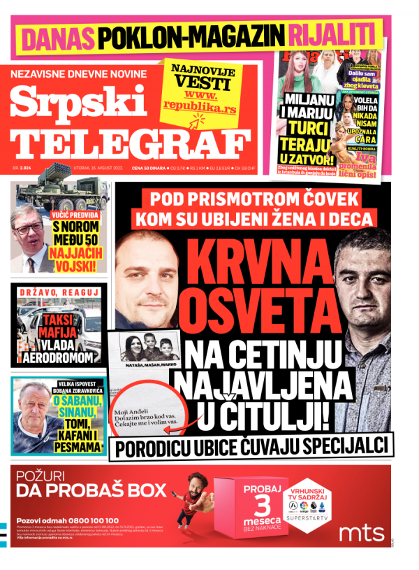 Naslovna strana Srpskog telegrafa za 15.08.2022.