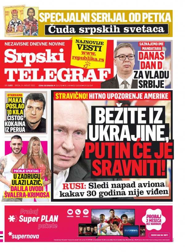 Naslovna strana Srpskog telegrafa za 24.08.2022.