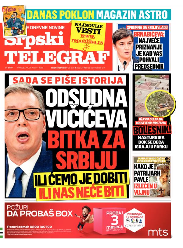 Naslovna strana Srpskog telegrafa za 29.08.2022.
