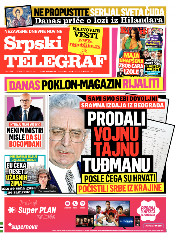 Naslovna strana Srpskog telegrafa za 30.08.2022.