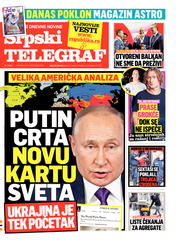 Naslovna strana Srpskog telegrafa za 05.09.2022.