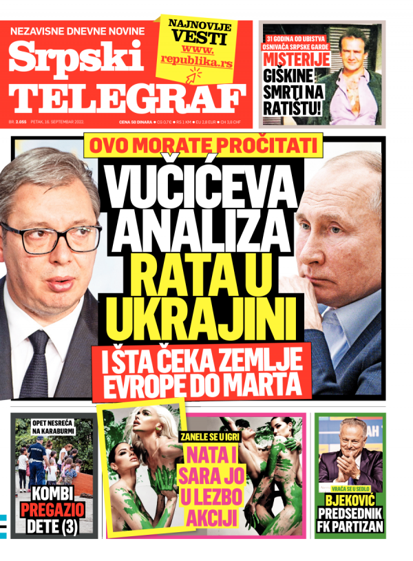 Naslovna strana Srpskog telegrafa za 16.09.2022.