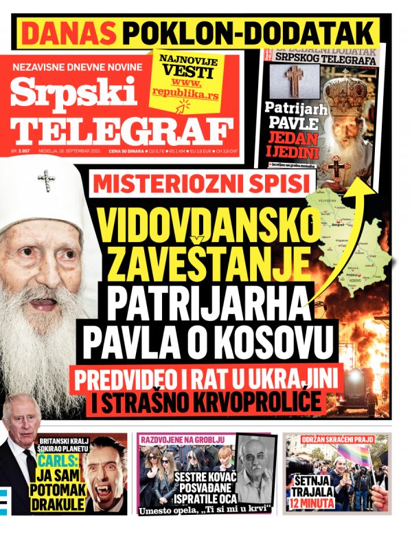 Naslovna strana Srpskog telegrafa za 18.09.2022.