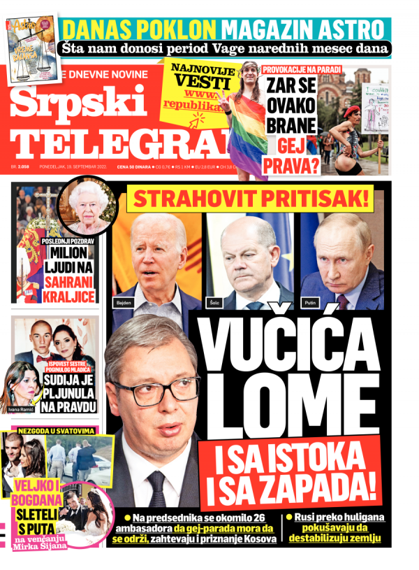 Naslovna strana Srpskog telegrafa za 19.09.2022.