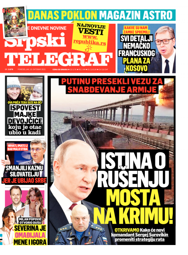 Naslovna strana Srpskog telegrafa za 10.10.2022.