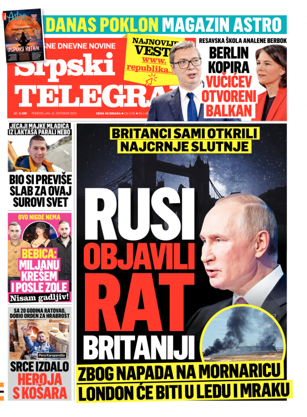 Naslovna strana Srpskog telegrafa za 31.10.2022.