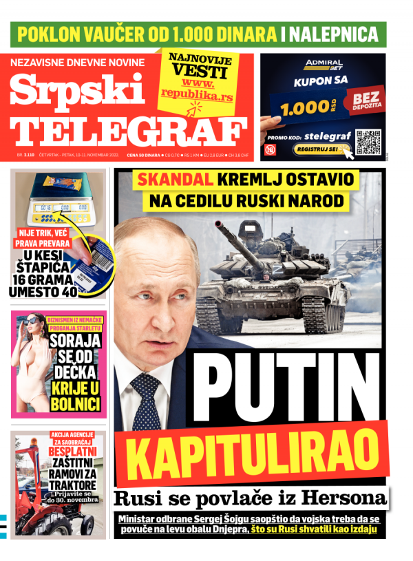 Naslovna strana Srpskog telegrafa za 10.11.2022.
