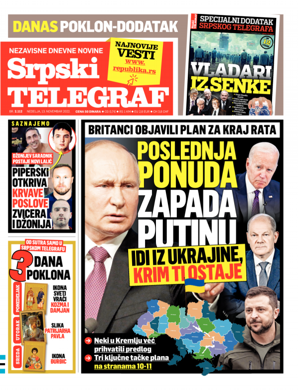 Naslovna strana Srpskog telegrafa za 13.11.2022.
