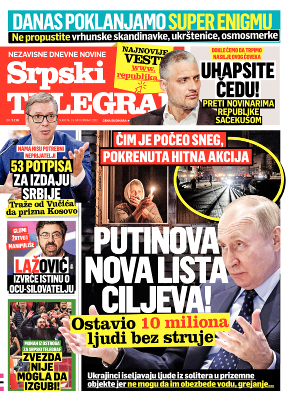 Naslovna strana Srpskog telegrafa za 19.11.2022.