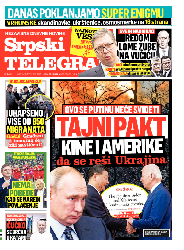 Naslovna strana Srpskog telegrafa za 26.11.2022.