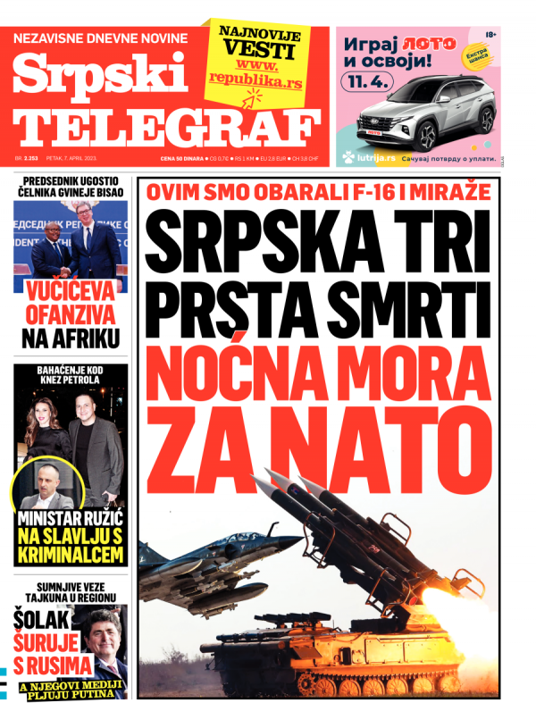 Naslovna strana Srpskog telegrafa za 07.04.2023.