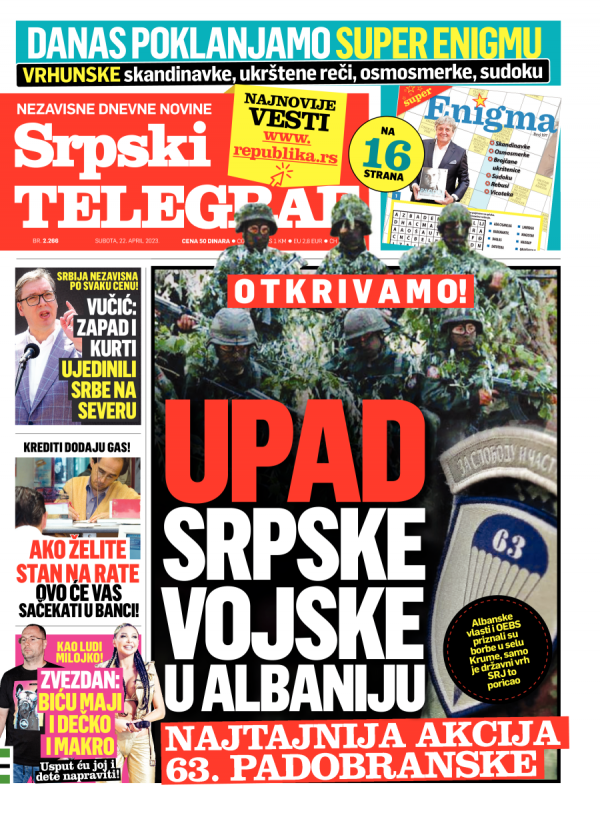 Naslovna strana Srpskog telegrafa za 22.04.2023.